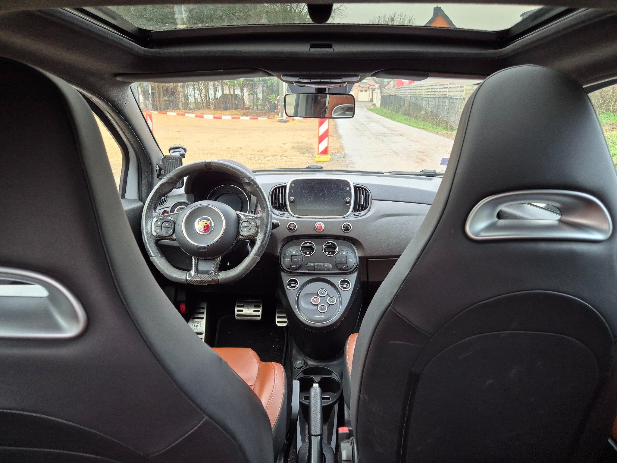 À l’intérieur, le 595 propose un habitacle compact mais parfaitement optimisé pour la conduite sportive. Tout d’abord, le poste de conduite intègre un volant sport, des sièges baquets et des commandes intuitives, offrant une prise en main immédiate. Ensuite, les matériaux de qualité et les finitions soignées assurent confort et style. L’écran central permet de gérer facilement la navigation, le multimédia et la connectivité smartphone, tout en restant orienté vers le conducteur pour une réactivité maximale.