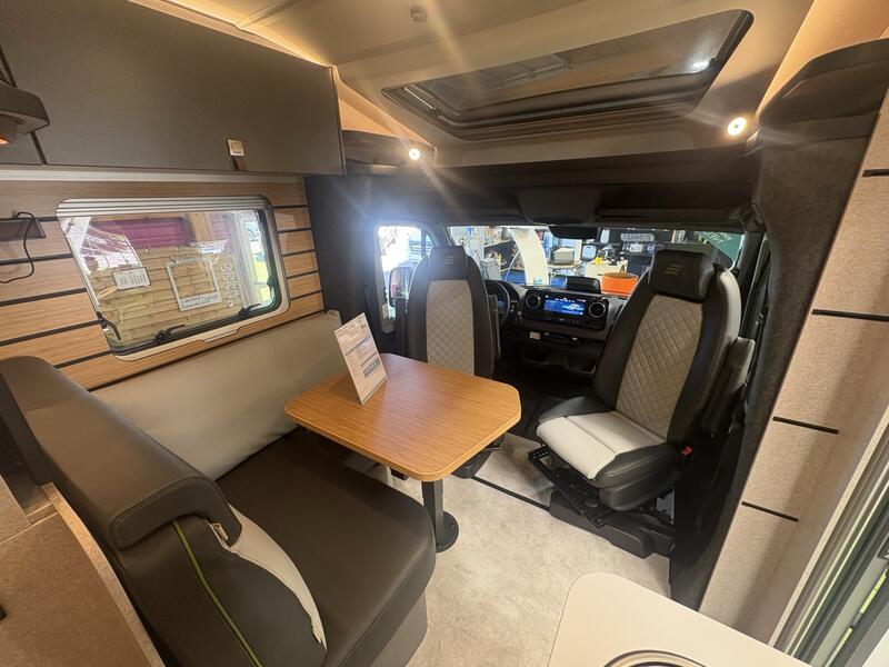 Le salon du HYMER ML-T 570 CrossOver constitue un véritable espace de vie, conçu pour favoriser la convivialité. Les assises confortables invitent à la détente après une journée d’exploration. La table centrale permet de partager des repas ou des moments de discussion dans un cadre agréable. Par ailleurs, les sièges de cabine pivotants s’intègrent naturellement à l’espace salon. Cette configuration optimise le volume disponible et renforce l’impression d’ouverture. Grâce aux larges surfaces vitrées, la lumière naturelle pénètre généreusement à l’intérieur. Ainsi, le salon devient un lieu accueillant et lumineux, propice au repos comme aux échanges.