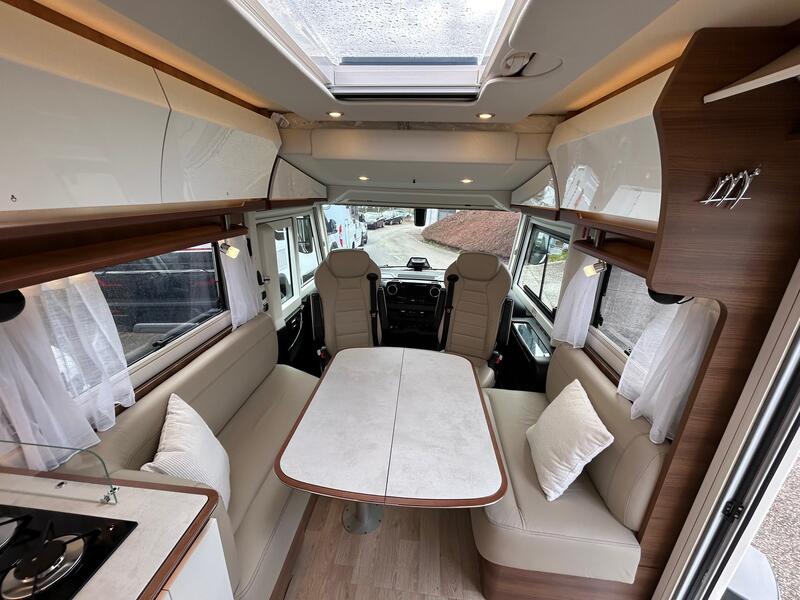 Le salon du RAPIDO i 196 M est pensé pour offrir un espace de vie confortable et modulable. Les assises généreuses permettent de se détendre après une journée de route ou d’activités. La table centrale, extensible et fonctionnelle, sert aux repas, au travail ou aux loisirs. Les sièges de la cabine sont pivotants, ce qui agrandit l’espace et favorise la convivialité. Les baies vitrées apportent lumière naturelle et vue panoramique, rendant l’espace agréable en toute saison. Ainsi, le salon se transforme en un véritable lieu de vie convivial et modulable pour tous les occupants.