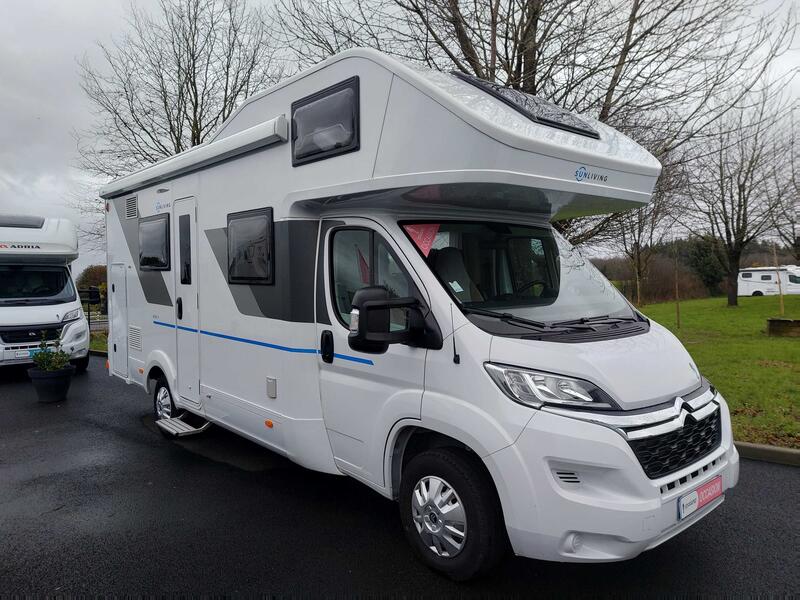 Le SUN LIVING A 70 DK propose un lit transversal à l’arrière , adapté pour deux adultes. L’espace sous le matelas offre des rangements pratiques pour bagages, couettes et oreillers.