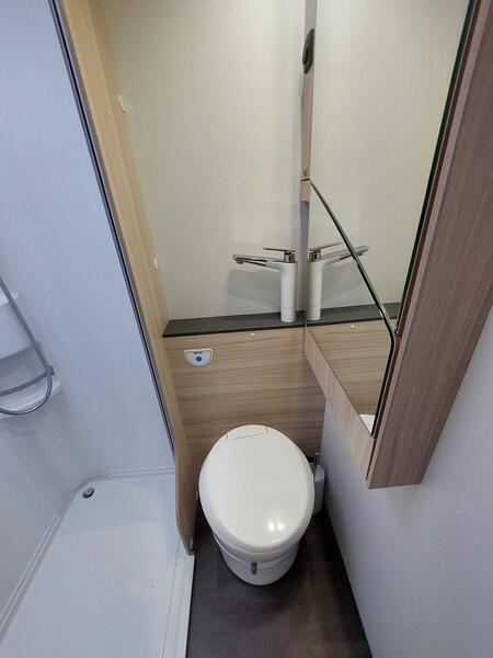 Le WC à cassette assure autonomie et facilité d’entretien. Le lavabo permet d’accomplir toutes les tâches d’hygiène quotidiennes. L’éclairage LED garantit une bonne visibilité tout en limitant la consommation d’énergie, idéal pour les séjours hors réseau.