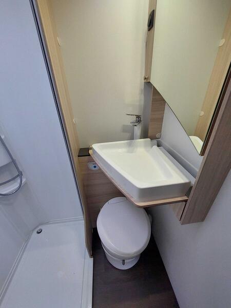 La salle d’eau se compose d’une cabine de douche séparée , d’un WC à cassette et d’un lavabo avec miroir et rangements . La douche reste suffisamment spacieuse pour un usage quotidien.