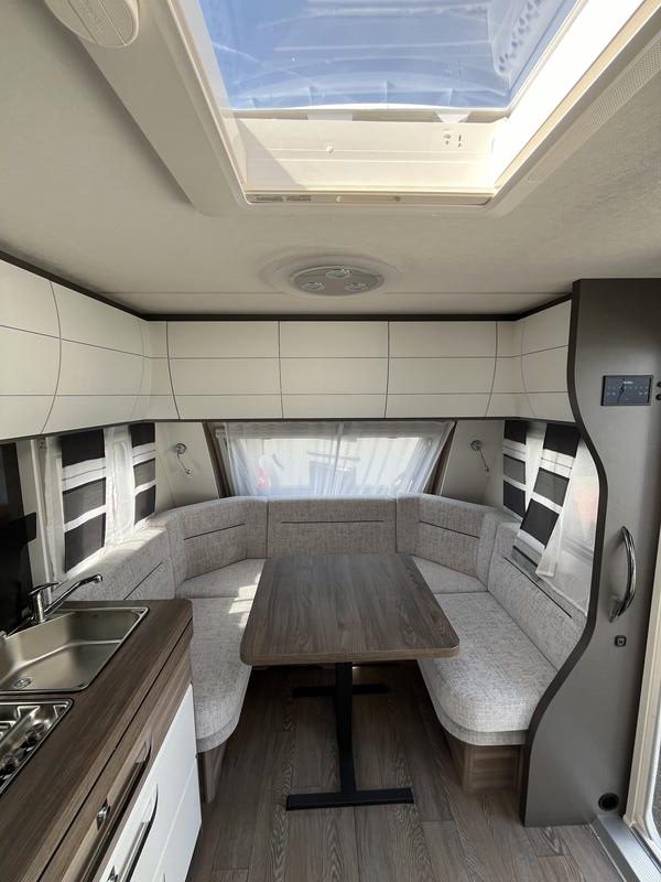 Le salon constitue le cœur de la vie à bord de la HOBBY 540 WLU EXCELLENT EDITION. Les assises confortables accueillent plusieurs personnes et favorisent la détente après une journée de voyage ou d’activités. La table centrale, extensible et pratique, peut servir pour les repas, le travail ou les loisirs. Les sièges peuvent être convertis en espace de couchage supplémentaire, augmentant la flexibilité de l’aménagement. Les grandes baies vitrées procurent une lumière naturelle abondante et une vue panoramique, rendant l’espace lumineux et agréable. Ainsi, le salon devient un lieu de vie modulable, convivial et accueillant pour tous les occupants.