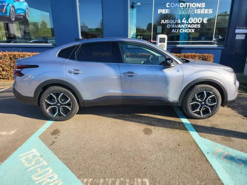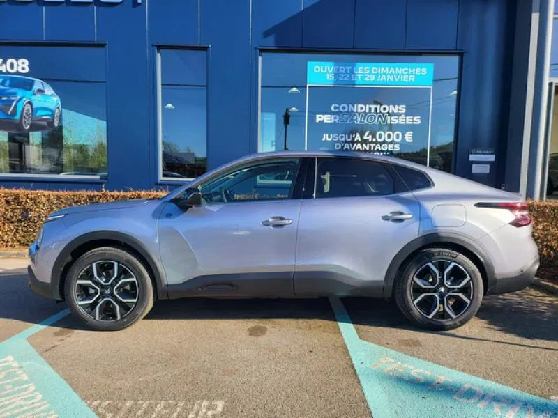 La Citroën C4 se démarque par un design original qui combine les codes de la berline et du SUV. Sa silhouette légèrement surélevée, ses lignes sculptées et sa signature lumineuse affirmée lui confèrent une allure dynamique et contemporaine. Ainsi, elle affiche une personnalité forte tout en restant élégante et accessible.
