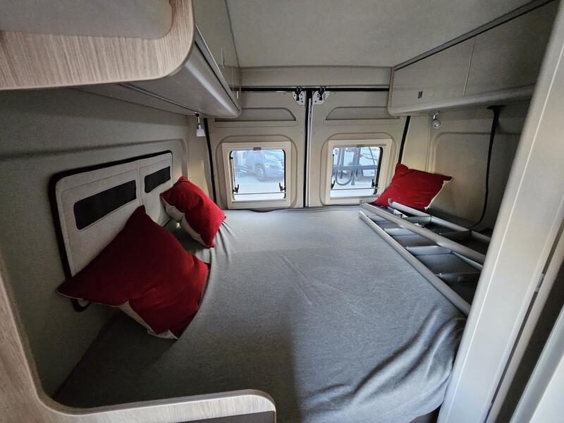 En outre, il propose jusqu’à 4 couchages selon les options retenues. La configuration standard comprend un lit transversal arrière et un lit de toit relevable, ce qui étend la capacité de couchage sans sacrifier l’espace au sol. Annonces-Caravaning