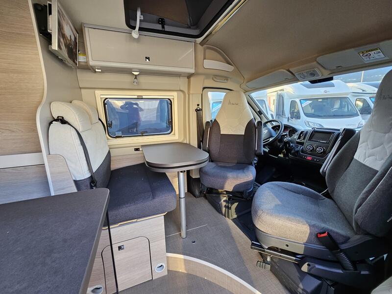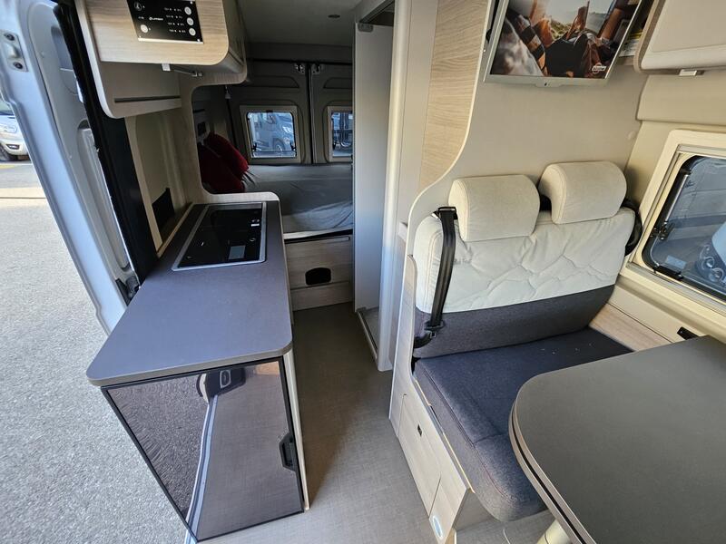 L’intérieur du Campeo C600 offre nombreux rangements astucieux répartis dans toute la cellule. Cela inclut des placards, des tiroirs sous les sièges et des solutions de rangement près des couchages. Annonces-Caravaning
