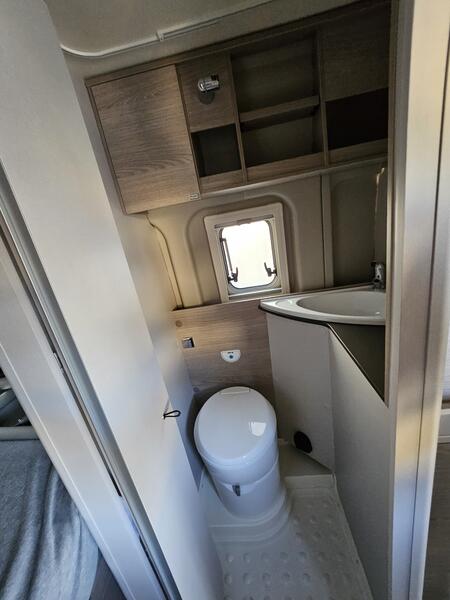 Le Burstner Campeo C600 Black Forest inclut une salle d’eau fonctionnelle, équipée d’une douche, d’un lavabo et d’un WC chimique. YpoCamp