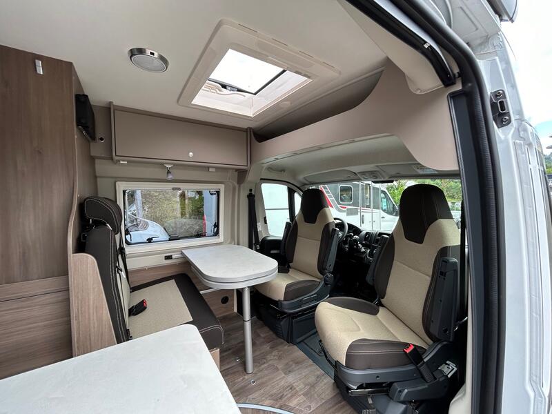 À l’intérieur, le Carado CV 600 propose un agencement intelligent et optimisé. Le salon avant, équipé de sièges cabine pivotants et d’une table modulable, crée un espace convivial pour les repas, la détente ou le travail.