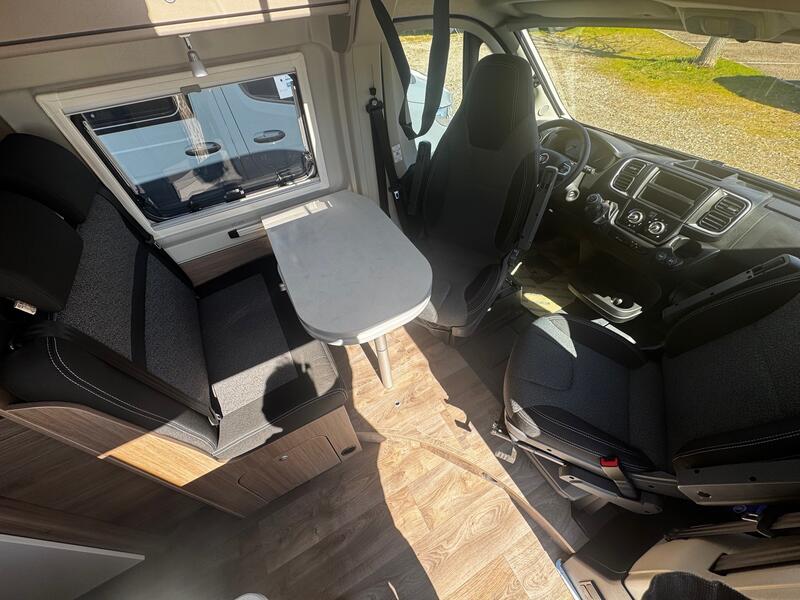 À l’intérieur, le CARADO CV 640 PRO offre un espace de vie optimisé, modulable et confortable. Le salon dispose de sièges pivotants, permettant de créer un coin repas convivial et agréable. La table modulable complète cet espace, facilitant les moments de détente ou les repas partagés. De plus, les circulations sont fluides, et chaque élément est placé pour maximiser l’espace disponible.