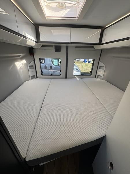 Le ELIOS VAN 59 T propose un lit transversal à l’arrière , adapté pour deux personnes. Il donne accès aux rangements situés sous le matelas.