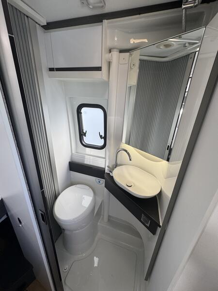La salle d’eau comprend une cabine de douche séparée , un WC à cassette et un lavabo avec miroir et rangements . La douche est confortable, même pour une utilisation quotidienne en voyage.