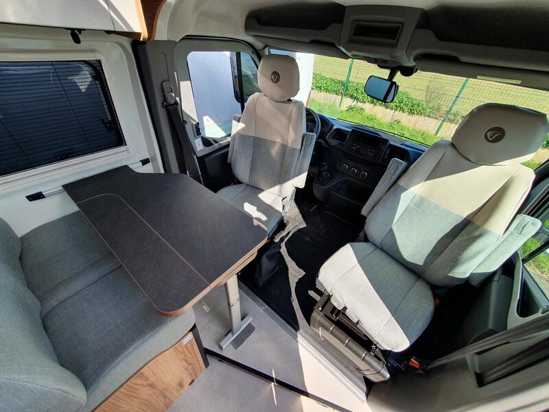 Les sièges avant pivotants agrandissent visuellement l’espace et transforment le coin jour en véritable salon convivial. Les nombreux rangements permettent de maintenir l’intérieur organisé, même lors de longs séjours.