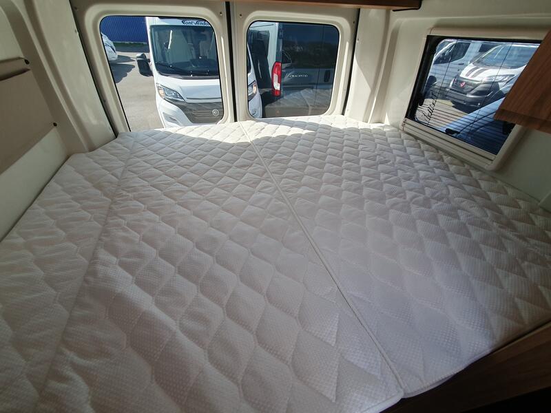 Le MASTERVAN propose un lit transversal arrière pour deux personnes. Les rangements sous le matelas permettent de stocker bagages et accessoires sans encombrer l’espace.