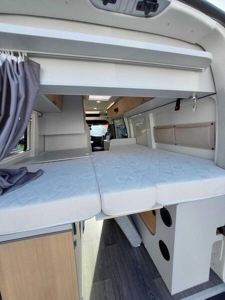 Ce modèle mesure environ 5,57 m de long , 2,07 m de large et 2,60 m de haut , ce qui lui permet de rester facile à manœuvrer, même en ville. Il accueille généralement 4 personnes en places carte grise et propose 2 à 3 couchages grâce à une configuration bien pensée. En outre, il est souvent équipé d’un moteur diesel Renault Master d’environ 135 à 150 chevaux , assurant une conduite agréable et une bonne tenue sur route, même chargé.