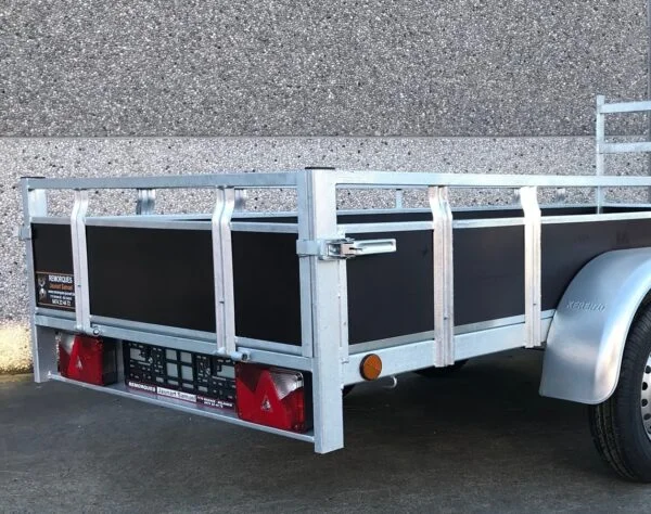 Cette remorque 300×132 cm (dimensions extérieures) double essieux est pourvue de feux d’encombrement (de côté) et d’une série de feux à l’arrière (feux de position arrière, feux-stop, feux clignotants, …). Les feux d’encombrement (de côté) sont obligatoires à partir d’une largeur de plus de 115 cm. La remorque est équipée d’une prise à 7 broches.