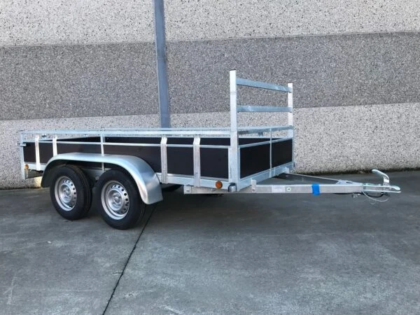 Cette Remorque 300×132 cm double essieux (dimensions extérieures) double essieux est pourvue de feux d’encombrement (de côté) et d’une série de feux à l’arrière (feux de position arrière, feux-stop, feux clignotants, …). Les feux d’encombrement (de côté) sont obligatoires à partir d’une largeur de plus de 115 cm. La remorque est équipée d’une prise à 7 broches.